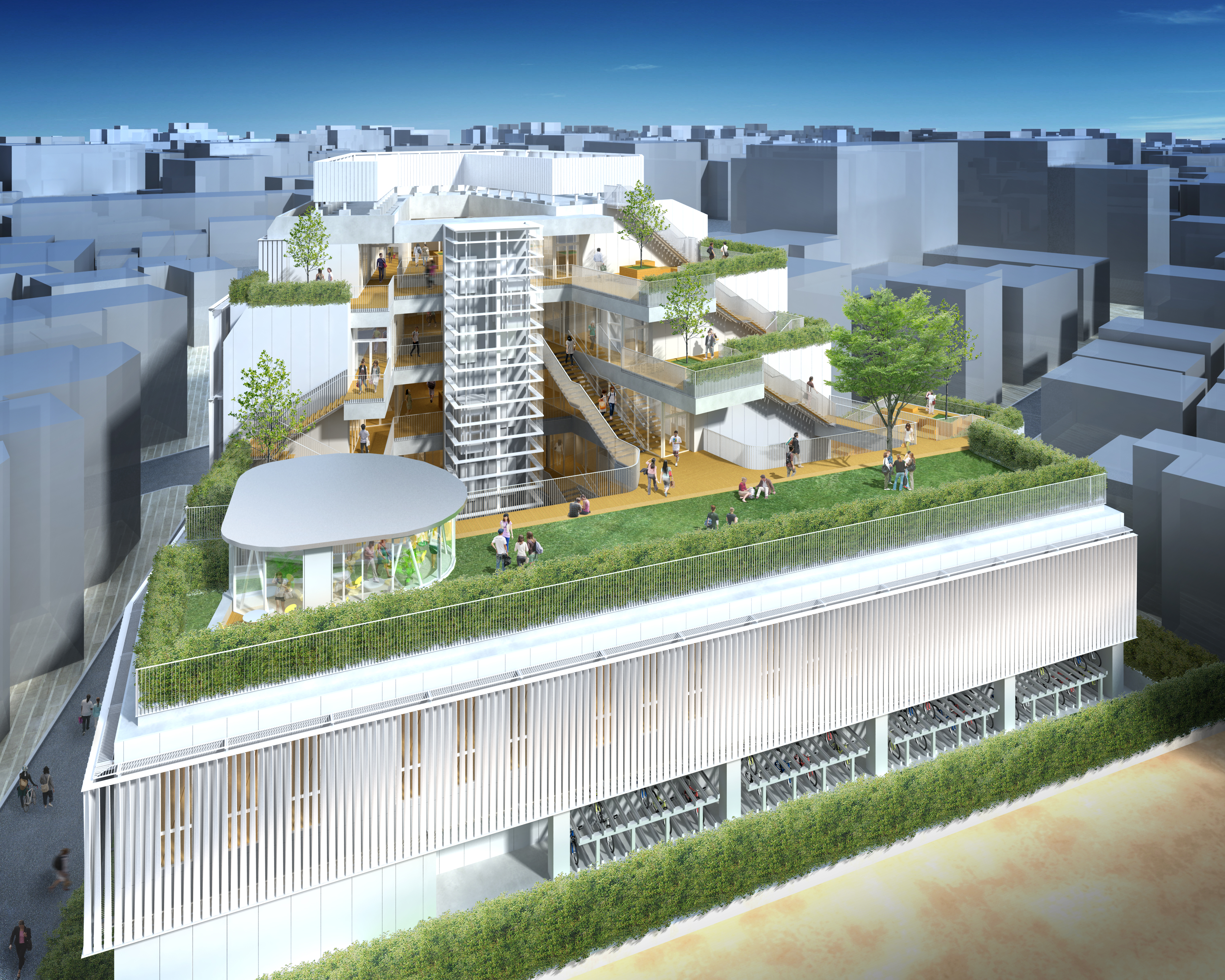都心の狭小地に立地する大学で共用空間を立体的に構成した「都市型立体キャンパス」をコンセプトに計画されました。