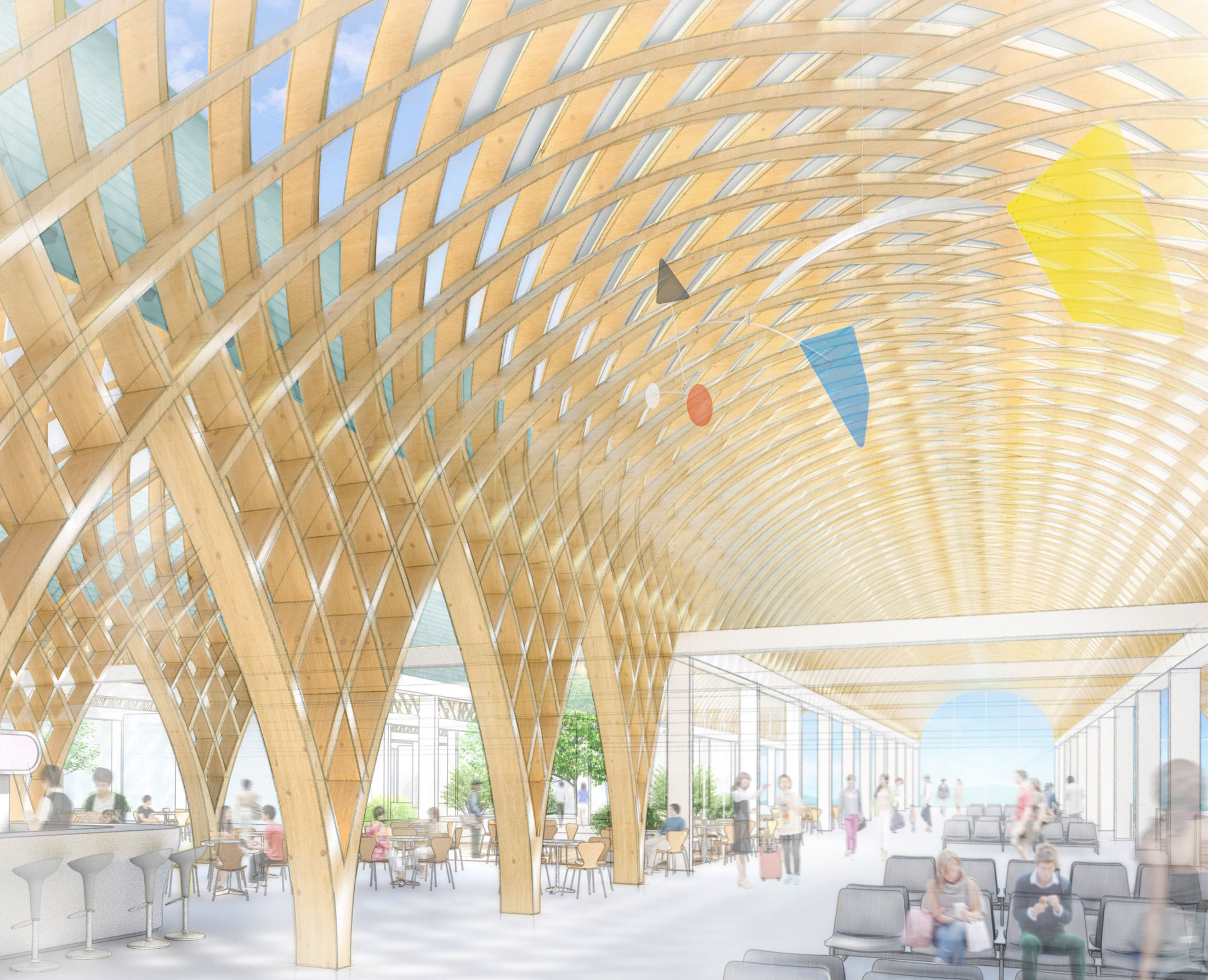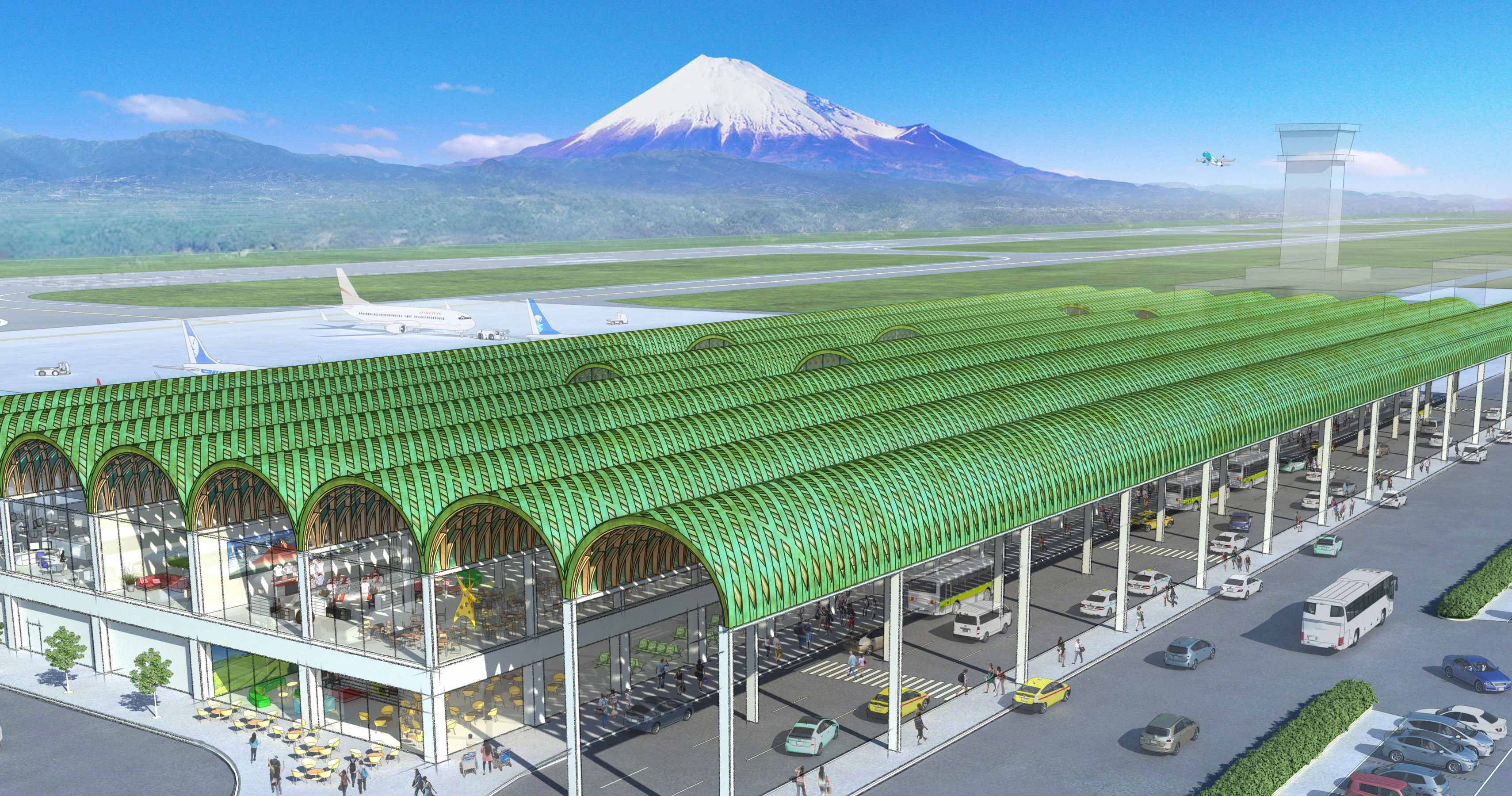 富士山静岡空港の旅客ターミナルビル等の改修・増築工事に伴う基本設計と実施設計の設計者を選定する公募型プロポーザル時のビジュアル制作業務です。牧之原台地の茶畑のイメージを表現したデザインとなっています。