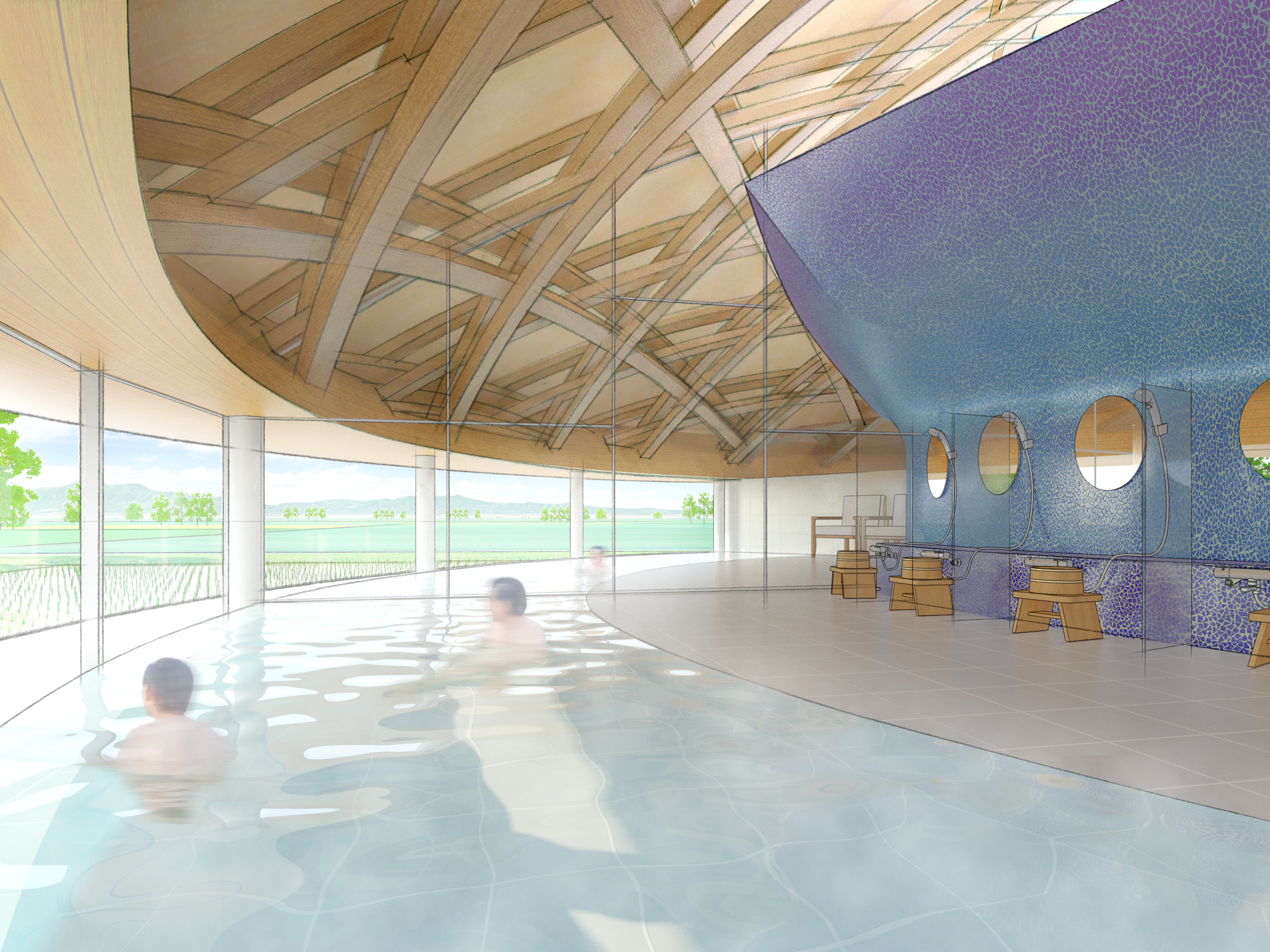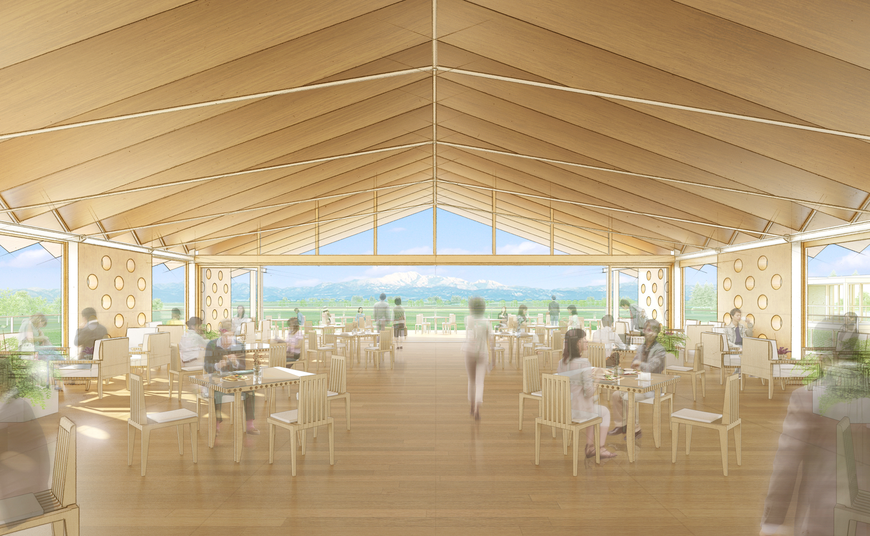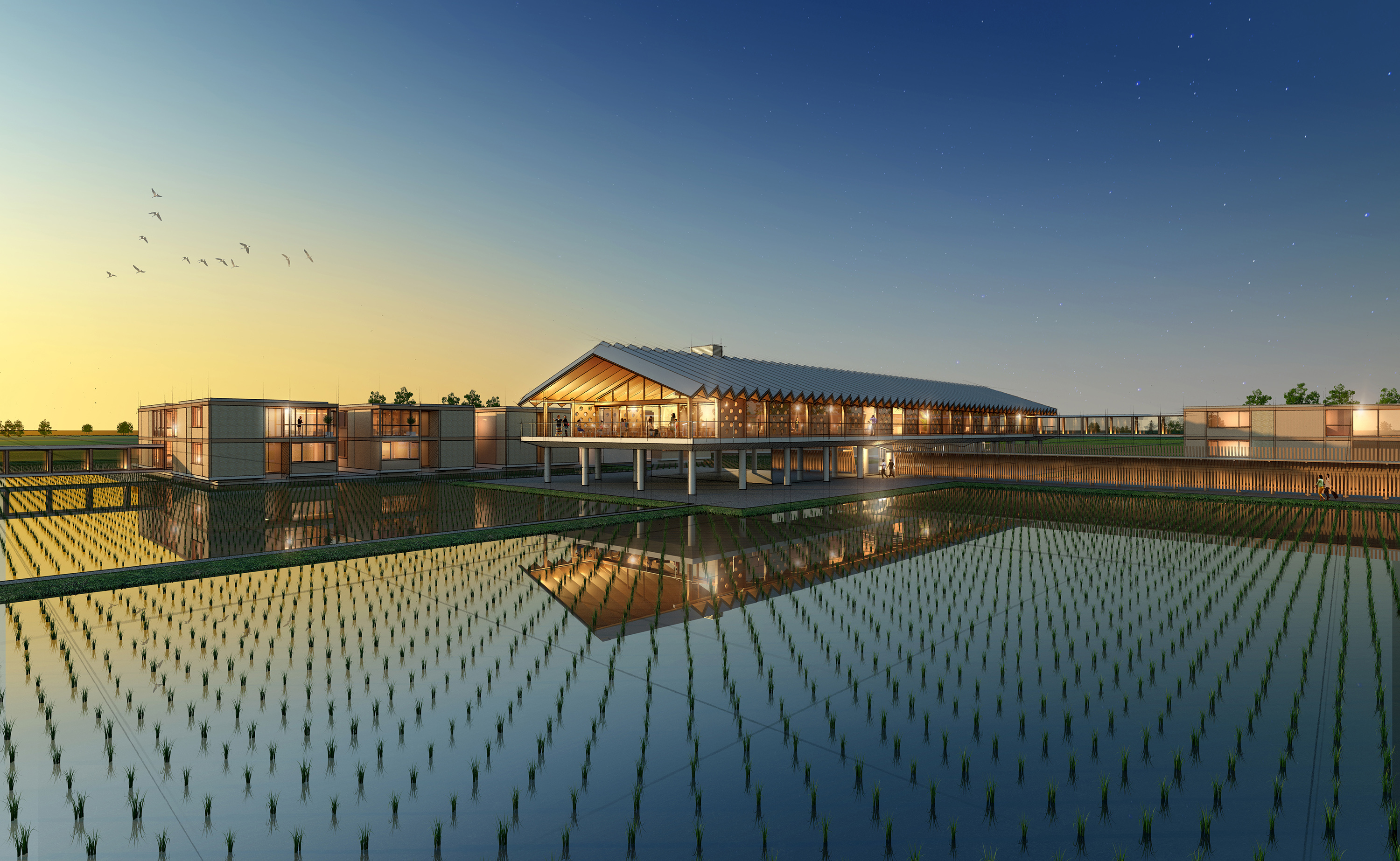 本計画は、山形県鶴岡市に建設された約150室規模のホテルプロジェクトです。庄内平野に広がる美しい水田の風景を損なうことなく、水田をそのまま残すことを前提に、建築の配置が工夫されています。ホテルは各機能に応じた3つの異なるシステムをもつ木造建築から構成されており、それらの建物を敷地内に点在させることで、風景と調和した計画となっています。