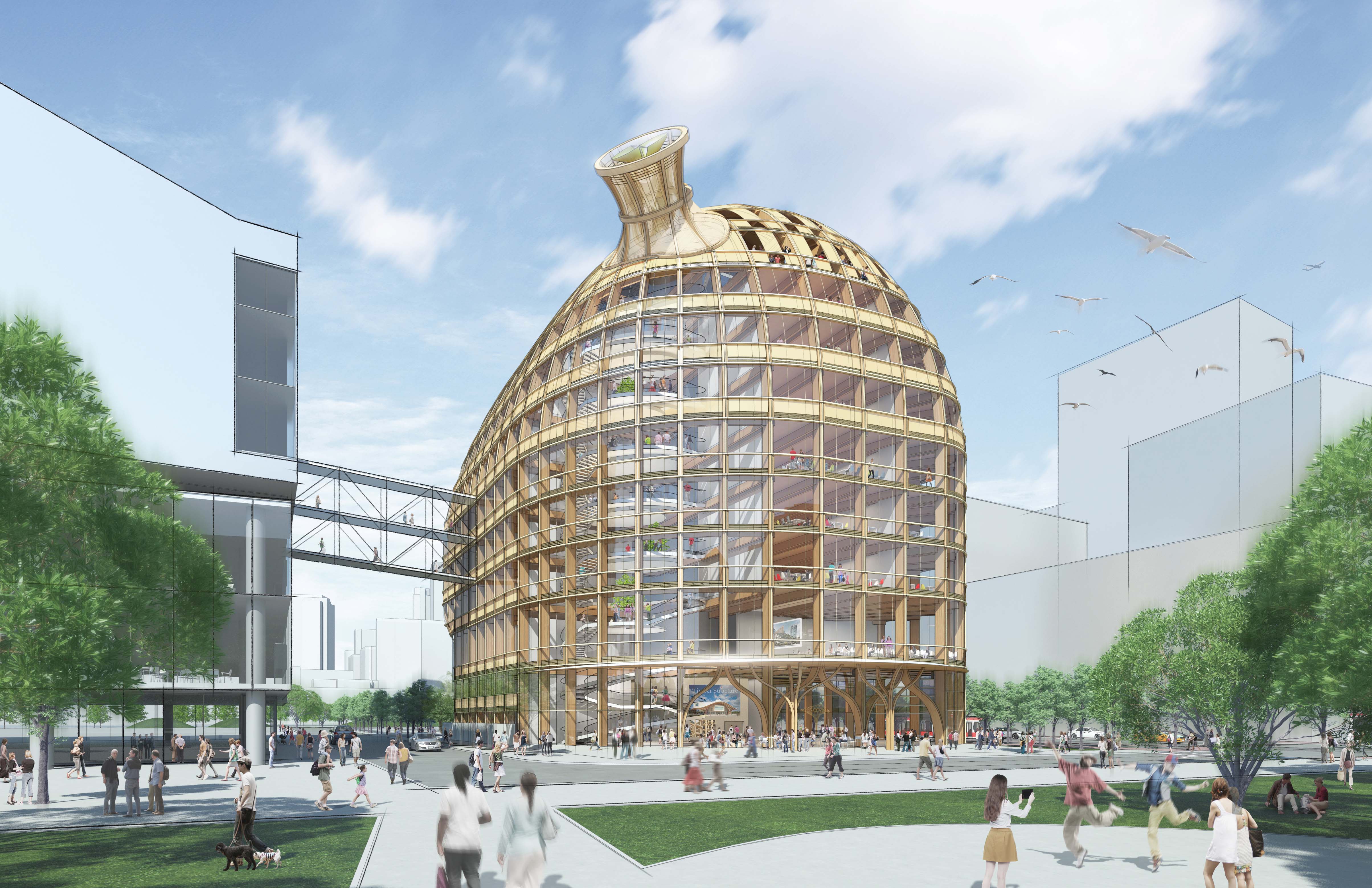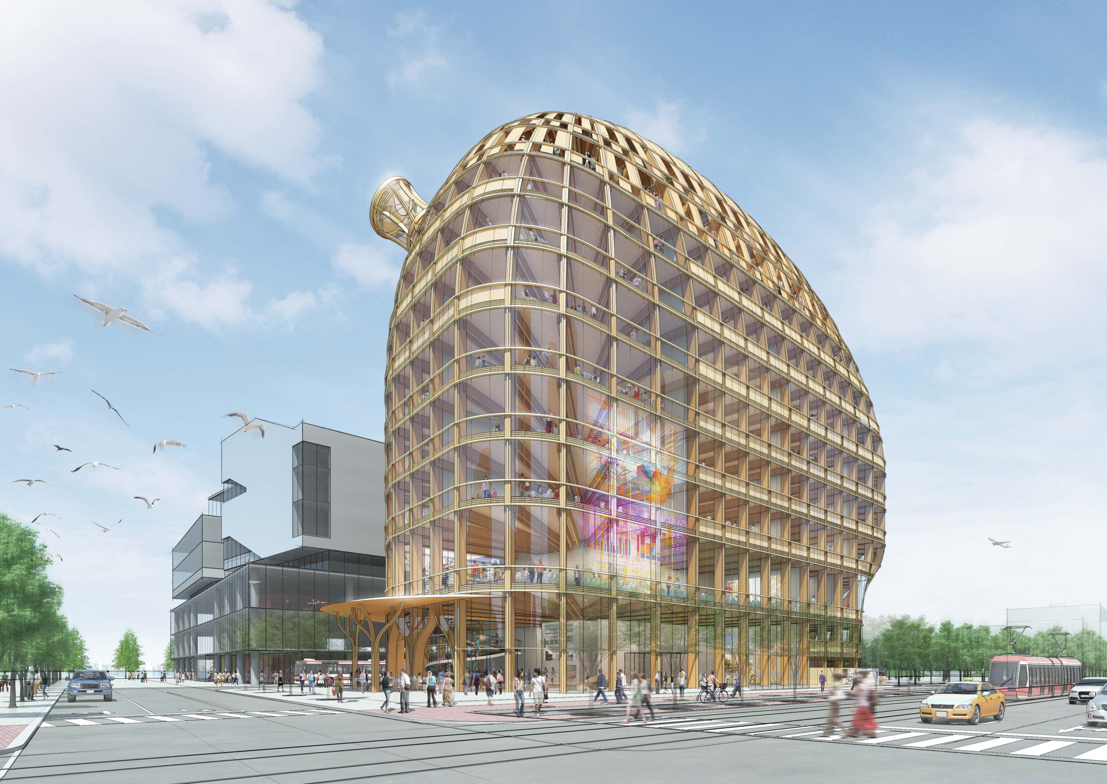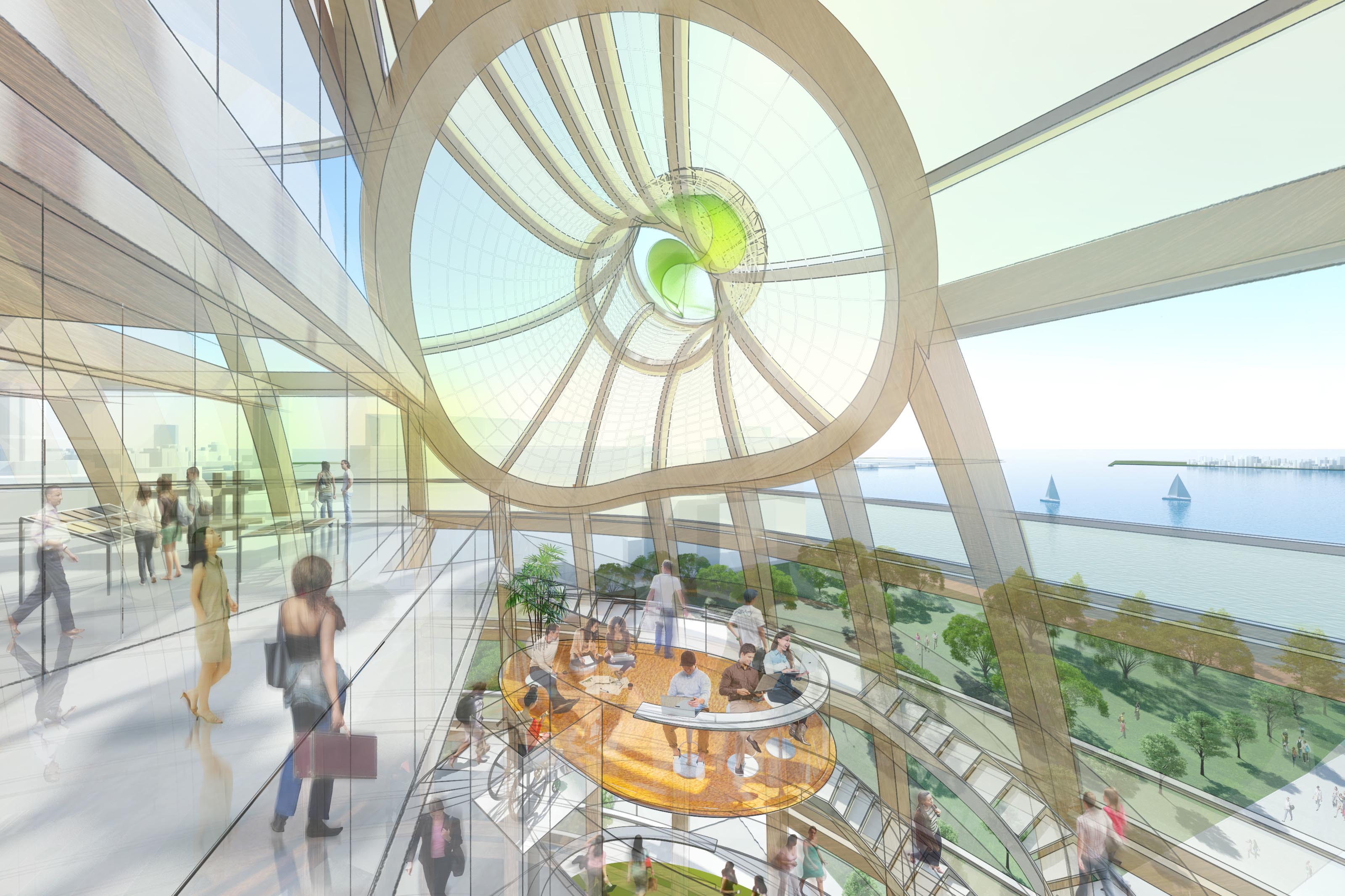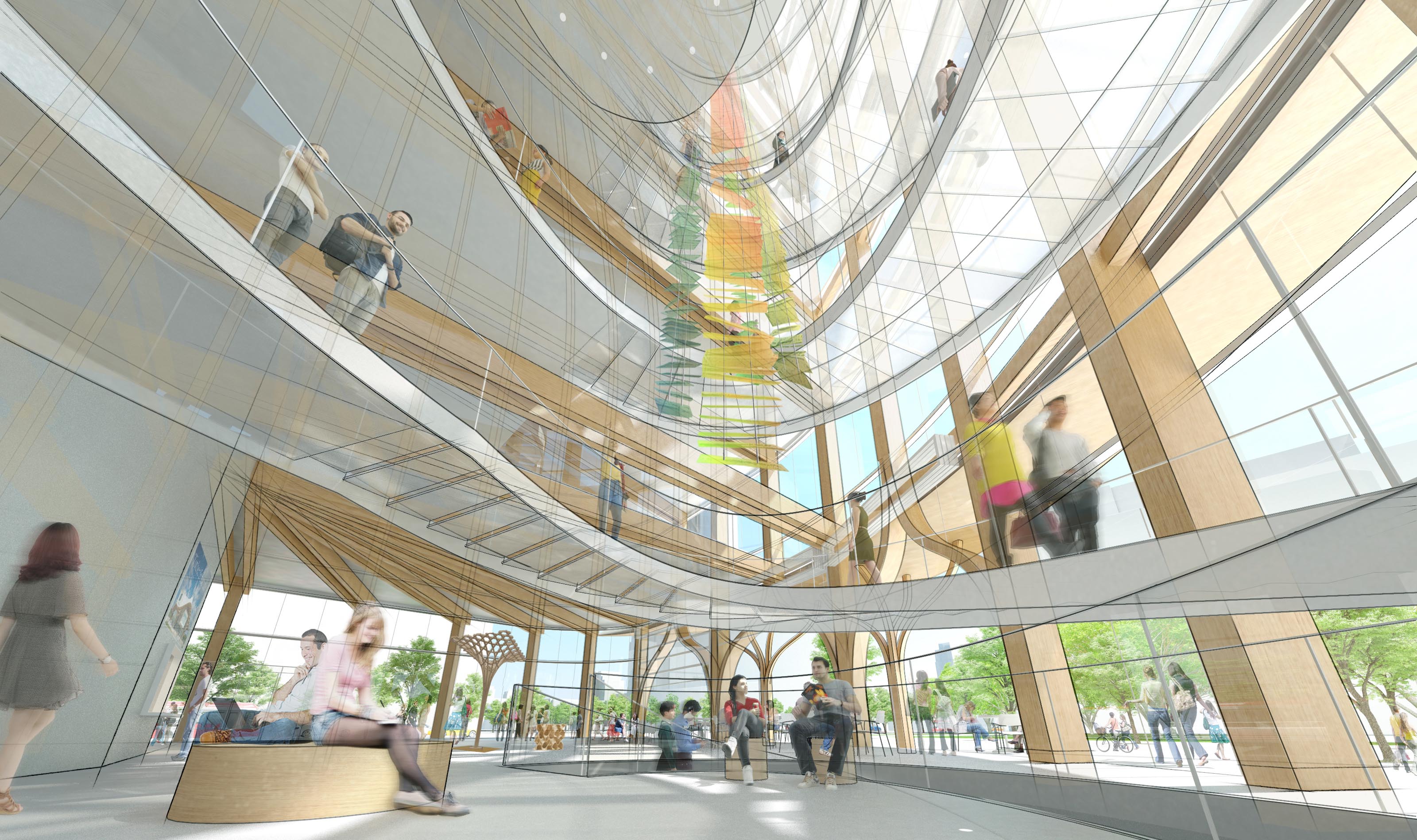 ハイブリッドマスティンバーを使用した10階建ての研究棟のビジュアル制作業務です。傾斜が緩やかな階段と、踊り場に位置するラウンジを備えた開放的なアトリウムが特徴となっています。