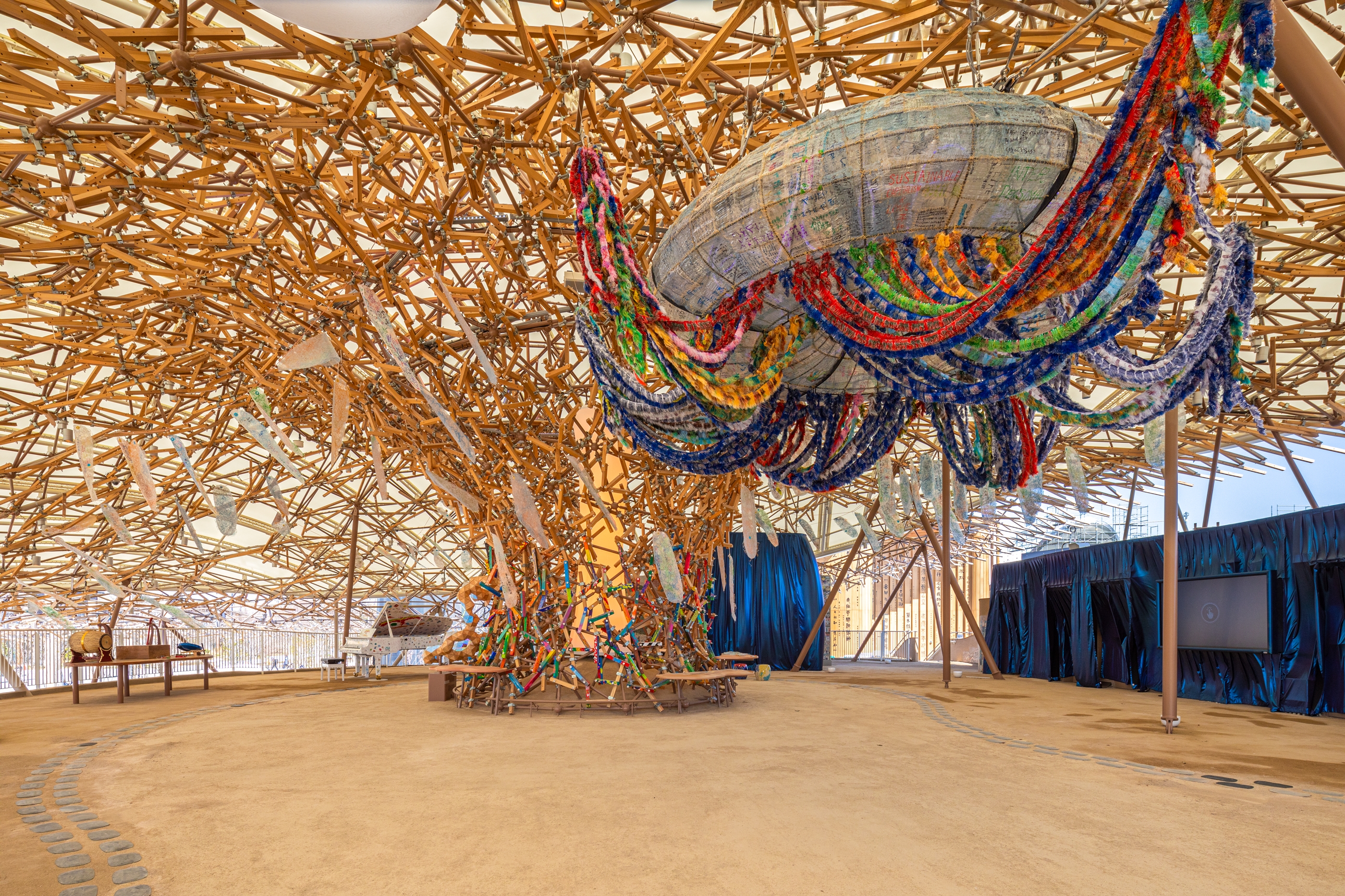 2025年大阪・関西万博のテーマ事業館パビリオン「いのちの遊び場 クラゲ館」において、中央から屋根全体に放射状に広がる「創造の木」の木材配置パターンの検討と、生産設計レベルの精度の高い3Dモデルの作成を実施設計段階で担当しました。