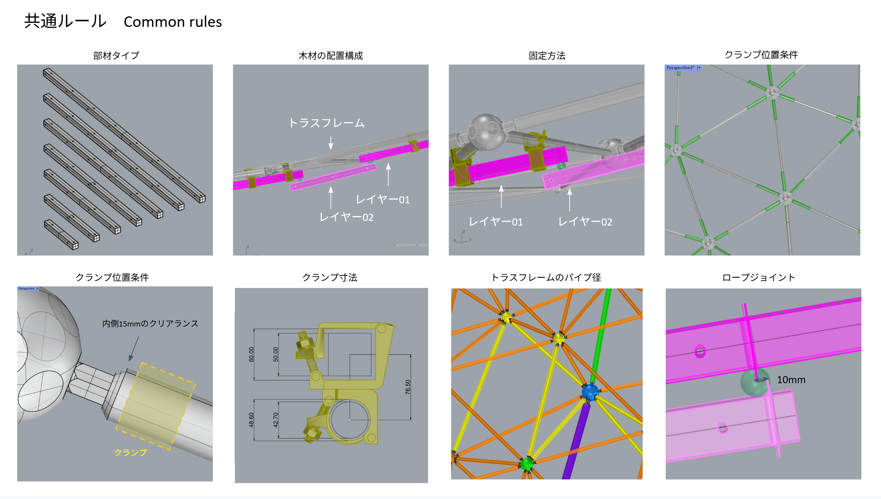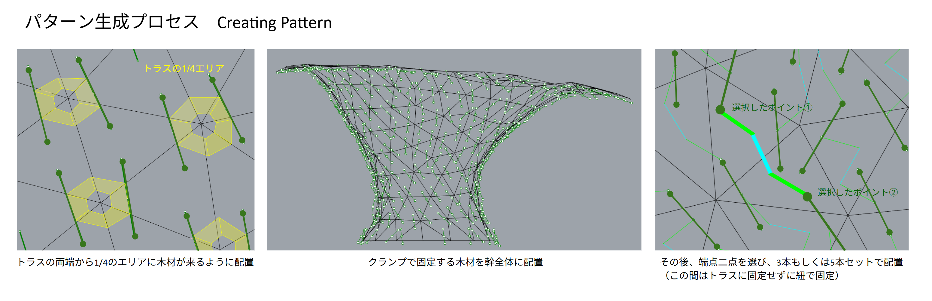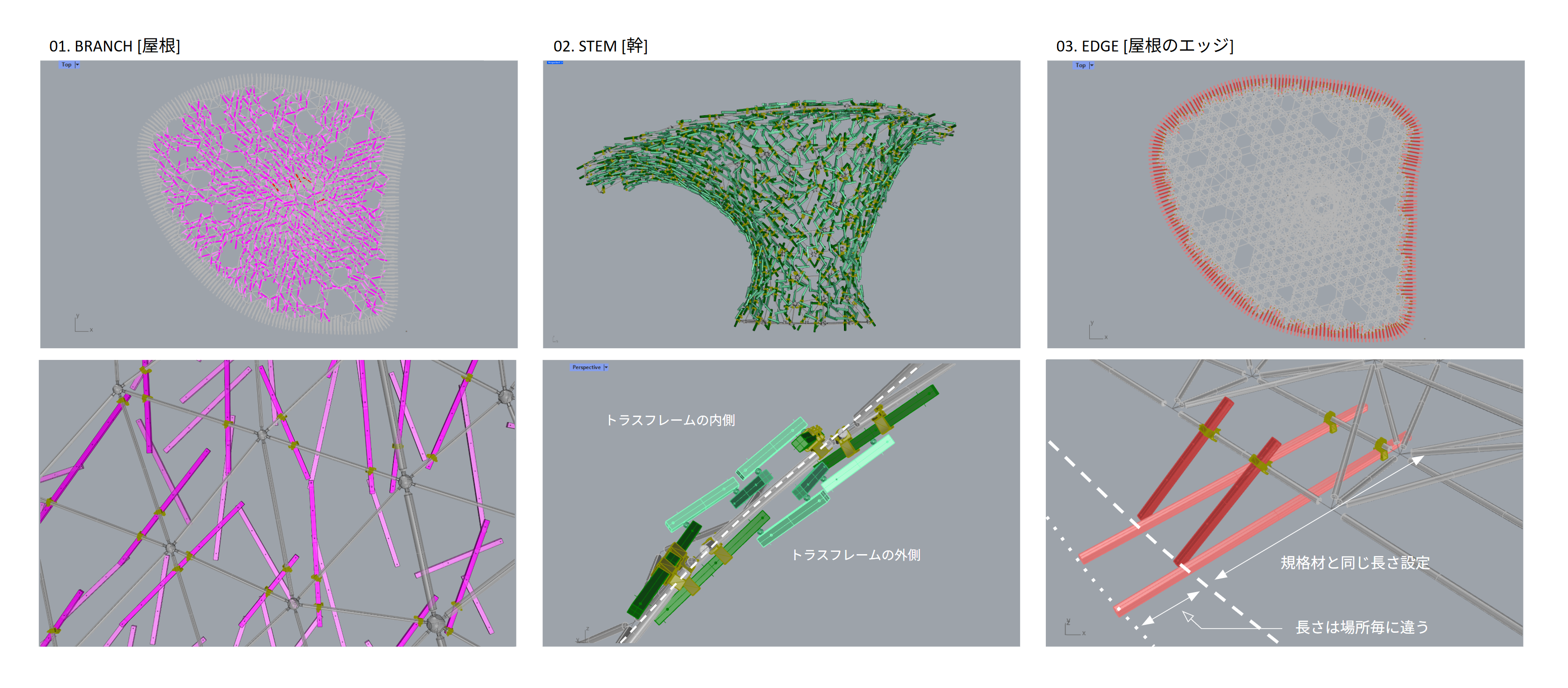 基本設計モデルでは、粘菌をモチーフとしたランダムな木材配置が示されていましたが、施工の実現性を確保することが大きな課題でした。そこで、意匠上の条件と施工上の制約条件、それぞれを整理し、長さを規格化した角材の利用、クランプ位置の確定、誤差を加味する接合方法などの条件を反映し、配置の密度感を達成させるアルゴリズムをつくり、3Dモデルでの検討を重ねました。