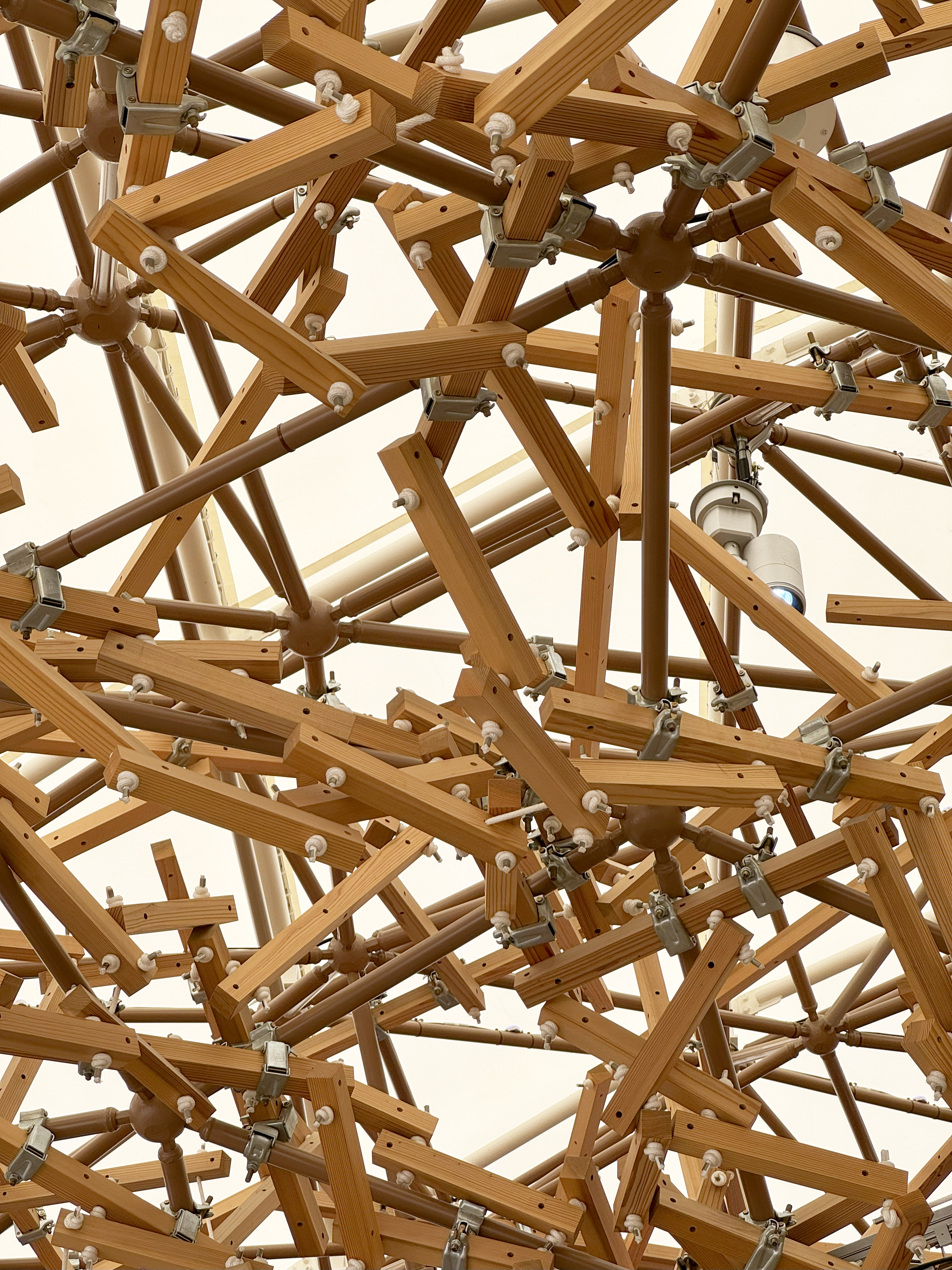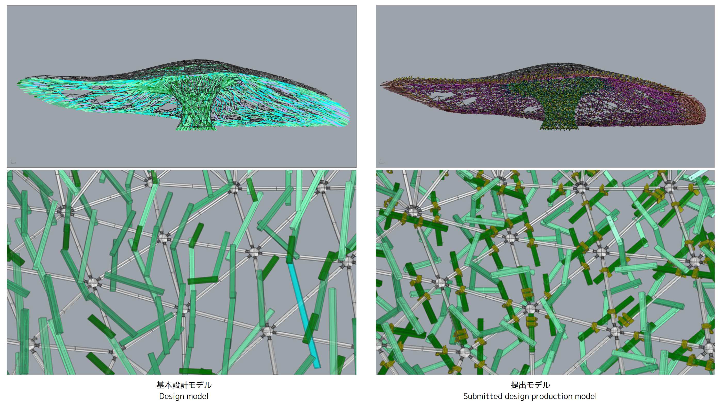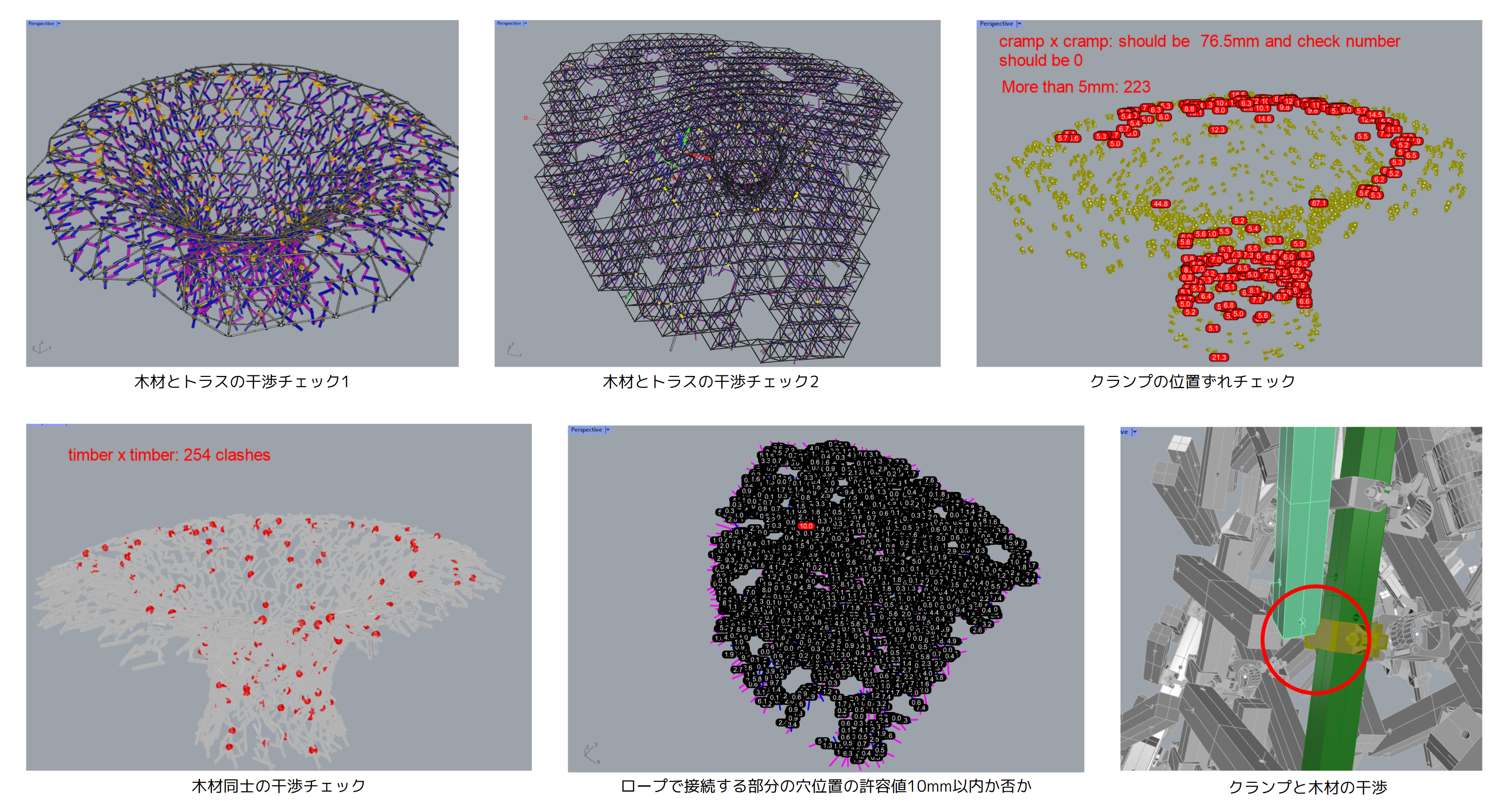 同時にプログラムを用いて干渉チェックも行い、約5,300本の木材、約3,200個のクランプ、トラス、これら干渉を修正し、実施設計段階ながら、生産設計レベルの高い精度のモデルを実現しました。